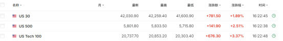 港股市场涨幅迅速扩大,恒生指数收涨近3%,恒生科技指数大涨超5%。美股市场同样情绪高昂,标普500指数期货、纳斯达克100指数期货和道琼斯指数期货均大幅上涨。