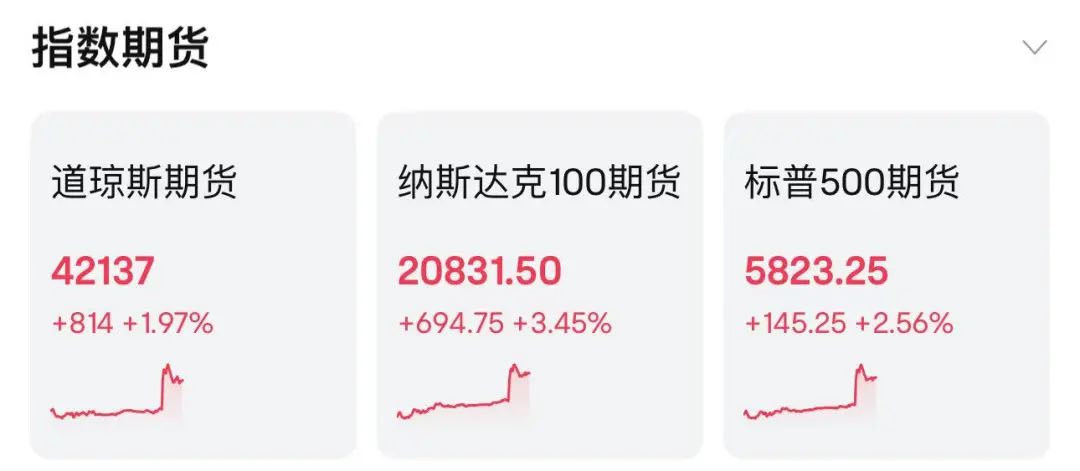 美股三大期指亦快速拉高,截至目前,纳斯达克100指数期货大涨超3%,进一步提振了市场信心。