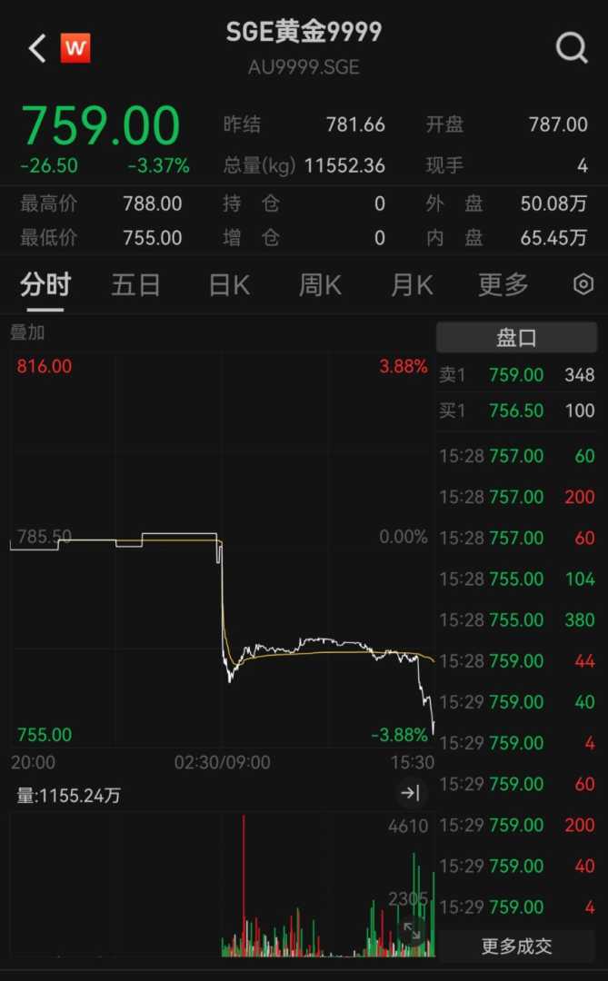 然而,受多种因素影响,5月12日黄金价格持续走低。Wind数据显示,周一下午,上海黄金交易所现货黄金(Au99.99)收盘前再度跳水,盘中最低价至755元/克,收盘价报759元/克;沪金主力合约下跌约2%,收盘价报772.28元/克。这一走势与人民币的强势表现形成了鲜明对比。