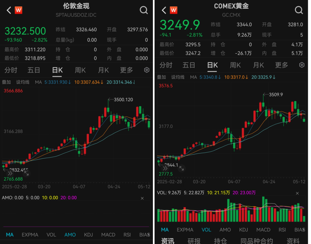 截至北京时间5月12日15点30分,上海黄金交易所现货黄金(Au99.99)价格走势显示,金价呈现明显下跌趋势。同时,Wind数据还显示,截至北京时间5月12日15点30分,伦敦现货黄金价格下跌约2.82%,报3232.5美元/盎司;COMEX(纽约商品交易所)黄金期货价格下跌约2.81%,报3249.9美元/盎司。国际金价同样呈现下跌态势。