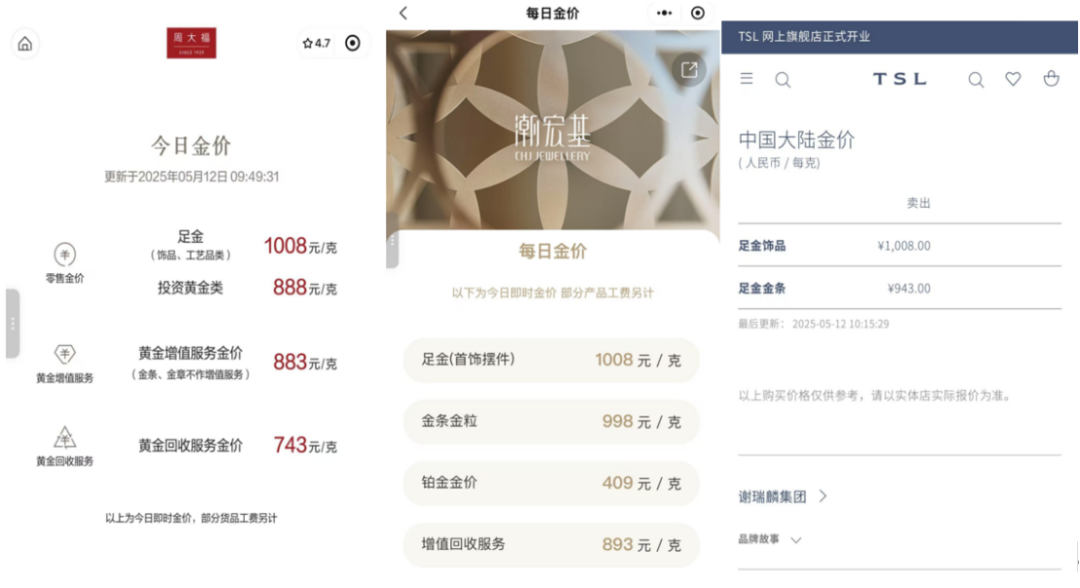当日上午,多家黄金珠宝品牌公布的单克境内足金首饰价格也普遍较前一日下跌超10元。具体而言,5月12日,周大福、六福珠宝、潮宏基、谢瑞麟、周六福等品牌的足金饰品境内价格均在1000元/克以上,但相比前一日均有明显下跌。
