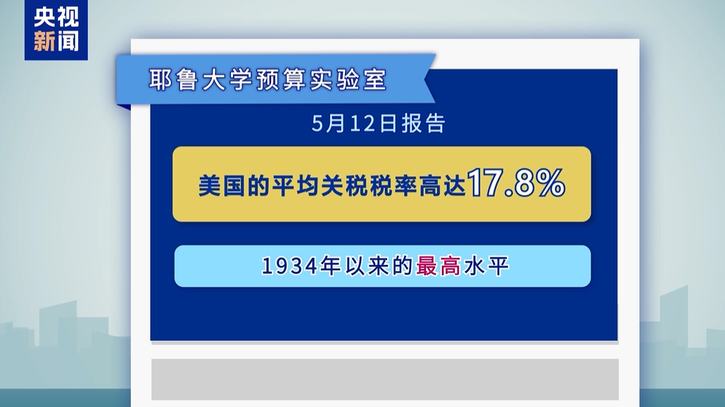 据央视新闻报道,中美经贸高层会谈取得实质性进展,但据美国媒体“消费者新闻与商业频道”报道,美国的关税税率仍是1934年以来最高,达到17.8%,给美国普通家庭造成平均每年2800美元的损失。