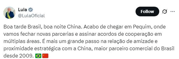 图片来源:巴西总统卢拉社交媒体账号帖文截图