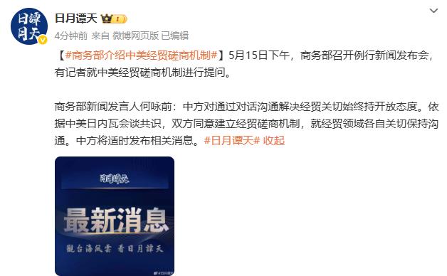 5月15日,商务部新闻发言人表示,中方愿意通过对话沟通解决经贸关切,并依据中美日内瓦会谈共识建立经贸磋商机制。此举体现了中方对中美经贸关系的积极态度,有望为中美经贸关系的稳定发展提供有力支持。