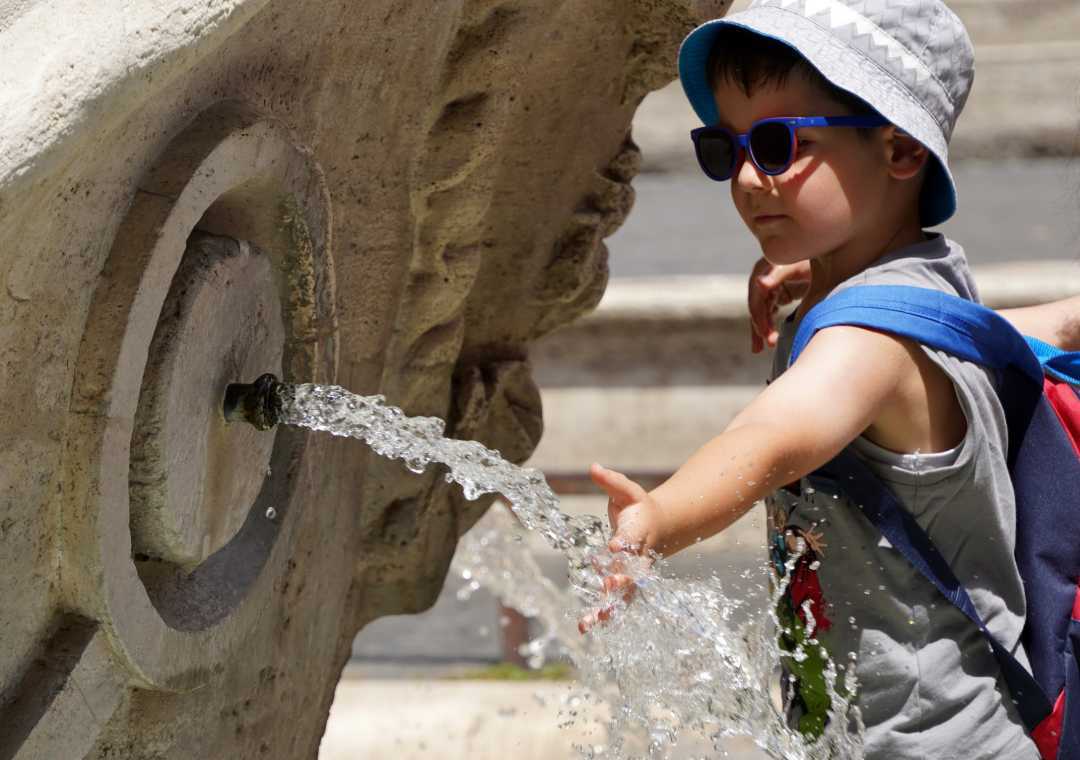 2023年7月18日,一名儿童在意大利罗马西班牙广场的喷泉处冲凉。新华社记者金马梦妮摄