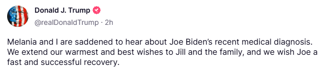 对此,美国现任总统特朗普在“真实社交”发文,对其病情深感悲痛,并向拜登及其家人致以最真挚的祝愿,盼其早日康复。