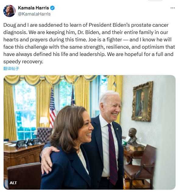 美国前副总统哈里斯亦发文表示,她和丈夫得知消息后深感悲痛,为拜登及其家人祈祷。哈里斯认为拜登是斗士,将以力量、韧性和乐观面对挑战,祝愿其早日康复。