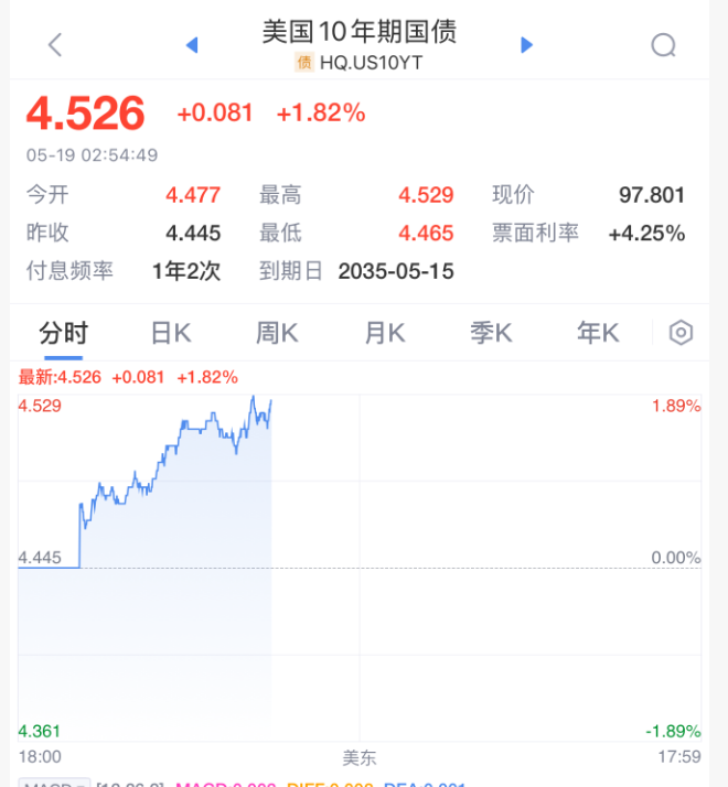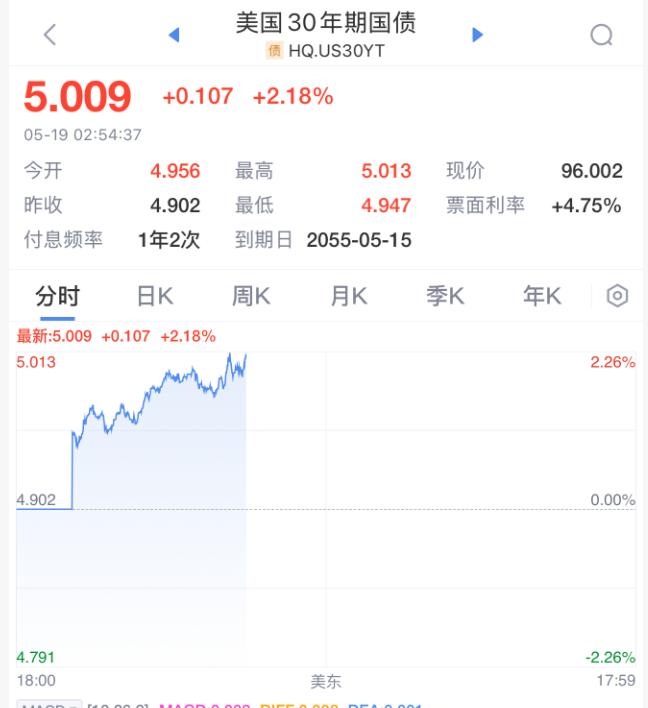 5月19日,美国股市与债市均遭受重创,美股三大股指期货齐跌,道指期货跌幅近400点,纳指期货下跌1.4%。