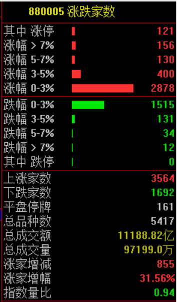 个股方面,市场呈现普涨格局,共有3564只个股上涨,其中121只个股涨停,1692只个股下跌,无个股跌停。