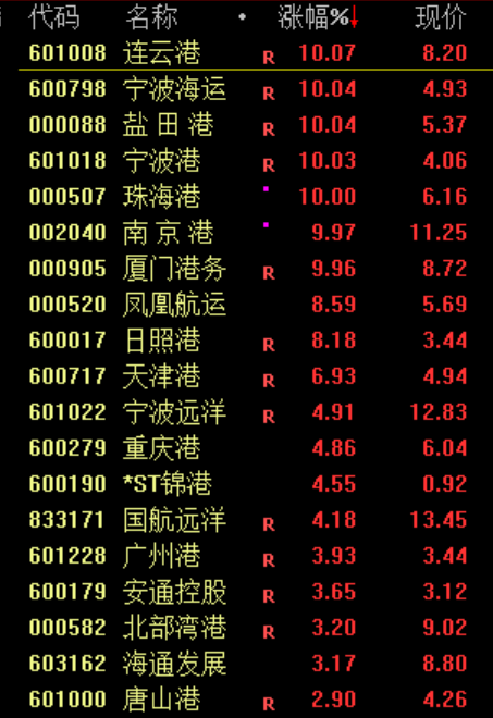 航运板块继续强势表现,宁波海运、连云港、珠海港等个股涨停。