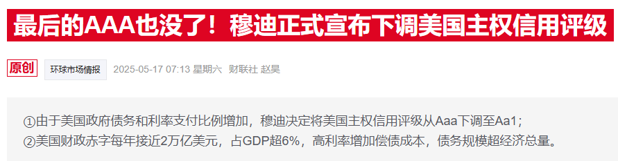 上周五,穆迪宣布因美国政府债务和利率支付比例增加,将美国主权信用评级从Aaa下调至Aa1。至此,美国在三大国际信用评级机构中均失去了最高的Aaa评级。