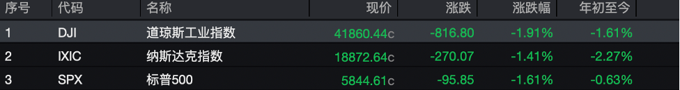 美股市场方面,三大指数均收跌。道琼斯工业指数跌1.91%,纳斯达克指数跌1.41%,标普500跌1.61%。