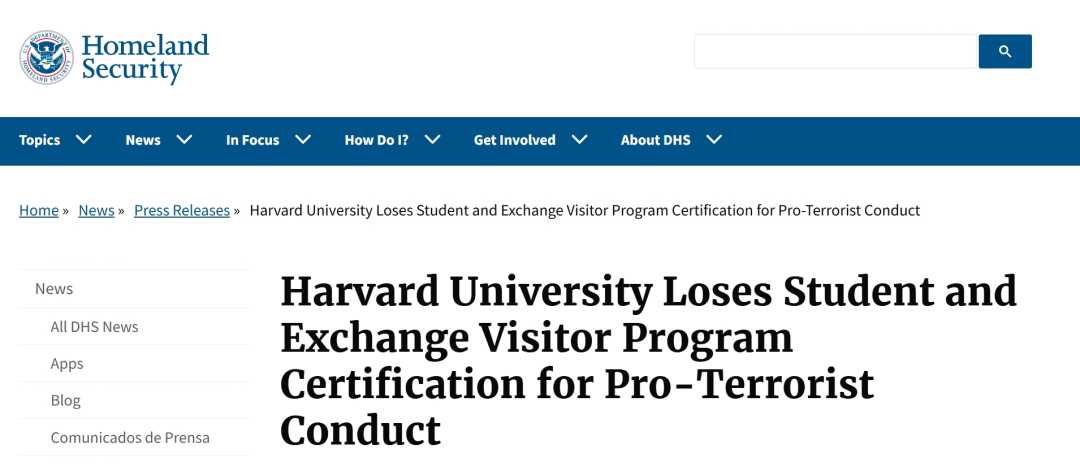 根据美国国土安全部官网声明,哈佛大学因“支持恐怖主义行为”被取消学生和交流访问者项目(SEVP)认证。这意味着哈佛大学将无法再招收国际学生,同时现有国际学生必须转学,否则将失去合法身份。此举将影响哈佛大学近6800名国际学生,约占学生总数的27%。