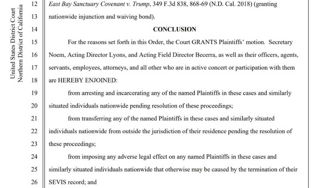 加州奥克兰市的一名联邦法官发布禁令,禁止特朗普政府在挑战多名国际学生合法身份的法律程序结束前,终止这些学生的合法身份。