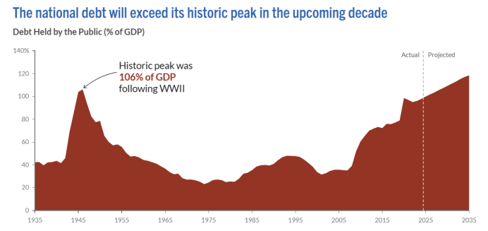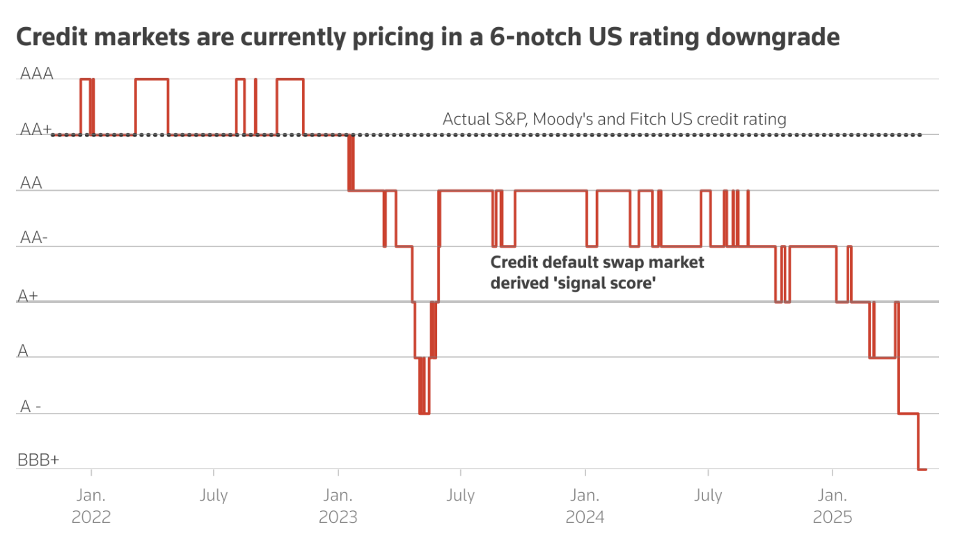 美元信心的崩塌和全球央行加速“去美元化”的趋势,使得市场对美国资产的担忧蔓延至其主权信用评级。上周,美国失去了最后一个Aaa信用评级。穆迪的数据显示,当前美国公共债务约占GDP的100%,预计到2035年将进一步上升至134%。从信贷市场定价看,华尔街似乎预计美国主权信用评级未来还将连降六级。