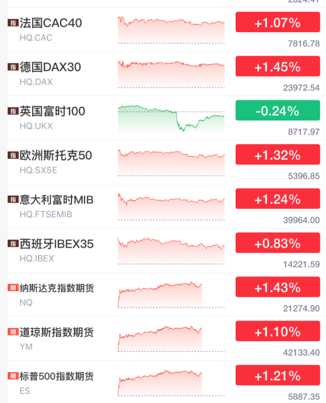 随着谈判气氛缓和,欧洲股市、美股三大股指期货上涨。