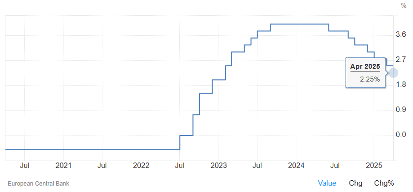 自去年6月以来,欧洲央行已七次下调存款机制利率至2.25%。市场普遍预计6月将再次降息0.25个百分点,年内或进一步降息。