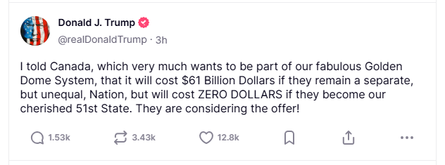 特朗普当天在Truth Social上发帖称,“加拿大非常希望加入我们的金色穹顶计划。若保持独立,则需支付610亿美元,但若成为第51个州,则无需任何费用。”