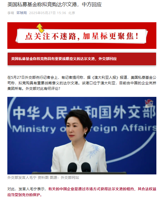 在5月27日外交部例行记者会上,有记者就美国私募基金公司拟竞购澳大利亚达尔文港事件进行提问。该港口具有重要战略意义,目前归中国企业岚桥集团所有。对此,外交部发言人毛宁表示,中国企业通过市场方式获得达尔文港的租约,其合法权益应得到充分保护。