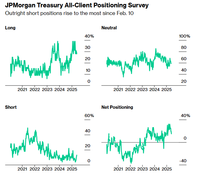 随着长期美债收益率在5%心理阈值附近震荡,交易员情绪愈发悲观。摩根大通调查显示,投资者预计美债抛售将进一步加剧,收益率持续攀升。同时,全球长期债券大幅下滑,看跌情绪蔓延。周四,美国财政部将标售七年期国债,再次考验市场对美债的需求。