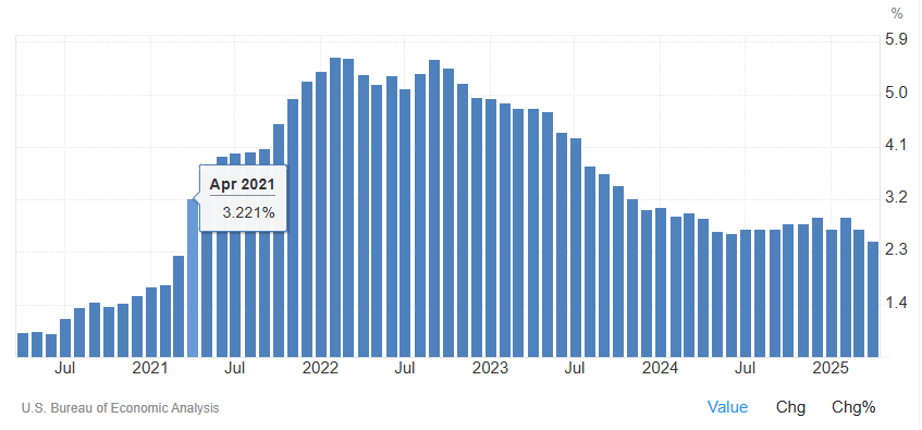 剔除能源和食品价格因素后,核心PCE价格指数环比增长0.1%,同比增速则从2.7%放缓至2.5%,同样符合预期。值得注意的是,2.5%的同比增幅创下了自2021年4月以来的最低水平。