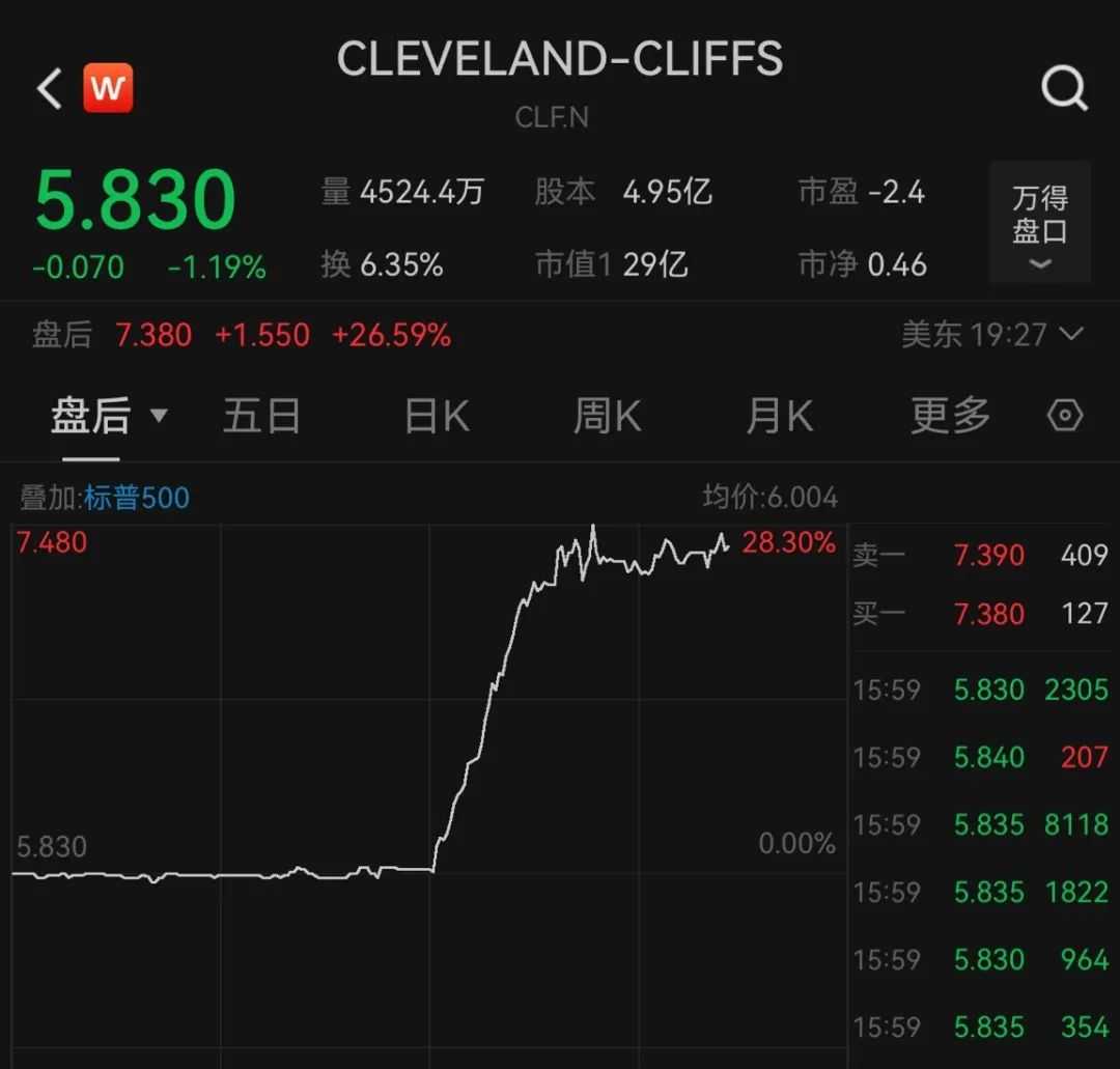 白宫通过社交媒体发布公告称,该决定将从下周起生效。此举引发美股钢铁股盘后普遍上涨,钢铁公司CLEVELAND-CLIFFS涨幅超过26%。