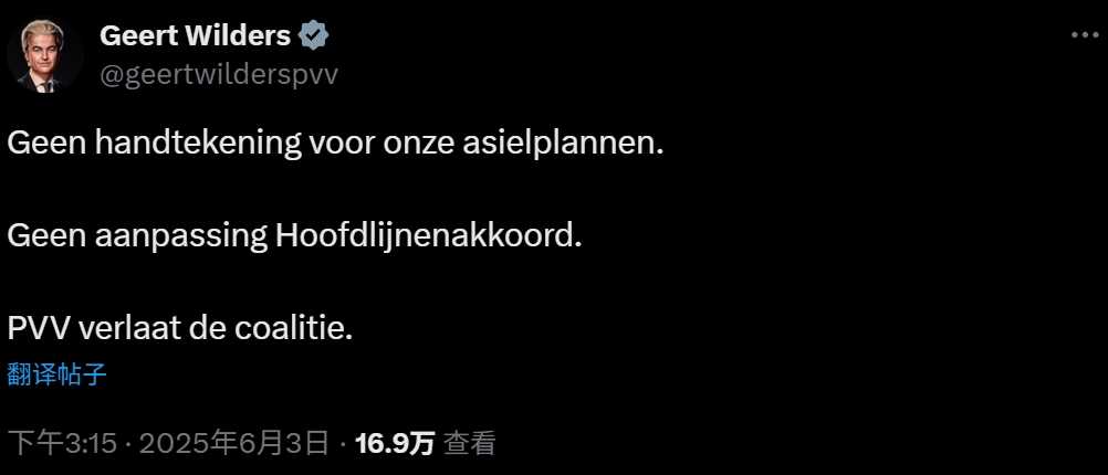 财联社6月3日讯 由于严格限制移民的计划未获联盟伙伴支持,极右翼政客基尔特·维尔德斯宣布其领导的自由党退出执政联盟,导致荷兰联合政府仅维持11个月便垮台。