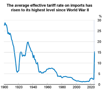 经合组织称,特朗普关税政策的影响、经济政策不确定性上升、净移民增速放缓以及联邦工作人员数量减少是此次下调美国经济增速的原因。美国实际关税平均水平已经升至二战以来新高(来源:OECD)。