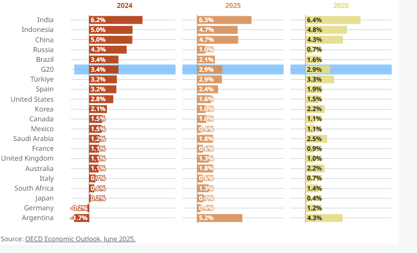 经合组织表示,“经济放缓主要集中在美国、加拿大和墨西哥”,而其他经济体预计将出现较小幅度的下调。全球GDP增长预计将从2024年的3.3%放缓至今年和2026年的2.9%……基于技术性上的假设,预计美国关税税率水平仍将维持下去,尽管其面临持续司法挑战。