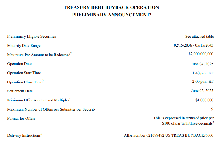 美国财政部周二发布公告,将在周三完成新一轮长期债券回购,重点关注2036-2045年到期的国债,最高回购20亿美元。