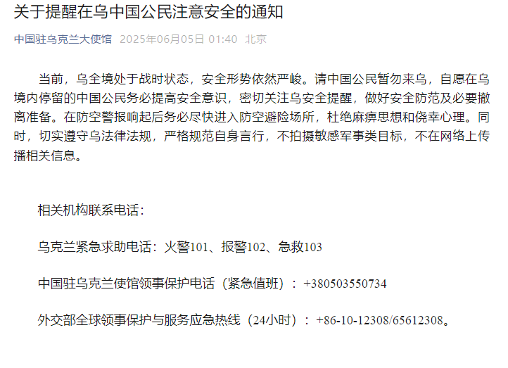 6月5日,中国驻乌克兰大使馆发布安全提醒,称乌克兰全境仍处于战时状态,安全形势严峻。建议中国公民暂勿前往,已在乌境内的公民需加强安全意识,做好安全防范及撤离准备,并提供了相关紧急联系电话。