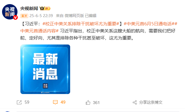 6月5日晚,国家主席习近平应约同美国总统特朗普通电话。习近平强调,为了校正中美关系这艘大船的航向,我们需要坚定地把好舵、定好向,特别是要排除各种可能产生的干扰和破坏,这一点至关重要。这一通话对于稳定中美两国的经济关系也具有重要意义。