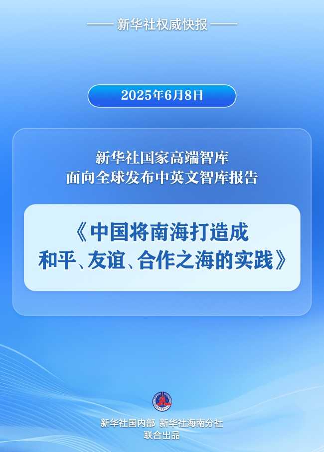 新华社国家高端智库6月8日面向全球发布《中国将南海打造成和平、友谊、合作之海的实践》中英文智库报告,深度阐释了中国将南海打造成和平、友谊、合作之海的实践成果和经验启示,展现了中国在南海问题上的坚定立场和积极贡献。