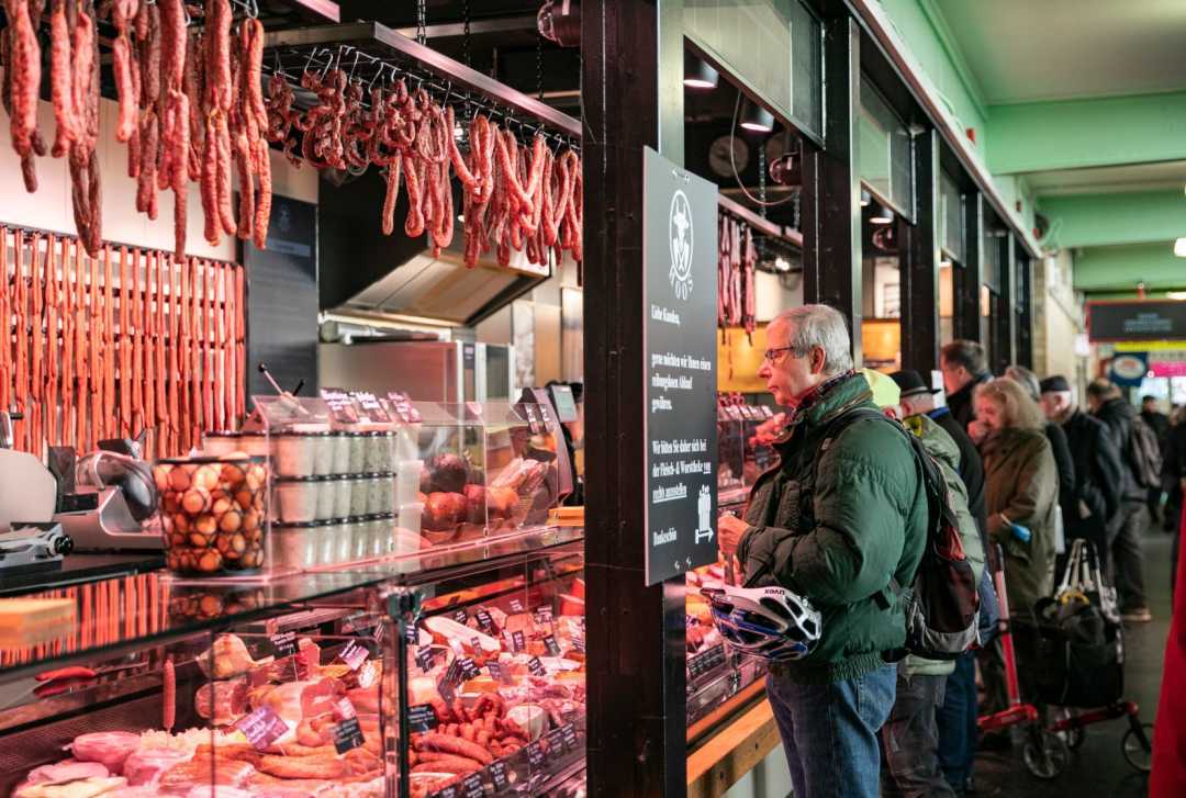 2023年12月20日,人们在德国法兰克福“小市场大厅”排队购买肉制品。新华社记者张帆摄