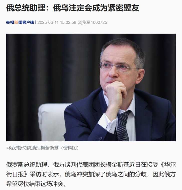 据央视新闻11日报道,俄罗斯总统助理梅金斯基近日在接受采访时表示,俄乌冲突加深了俄乌之间的分歧,俄方希望尽快结束冲突。梅金斯基表示,俄罗斯渴望和平,但如果乌克兰继续以其他国家的国家利益为导向,莫斯科将被迫做出回应。