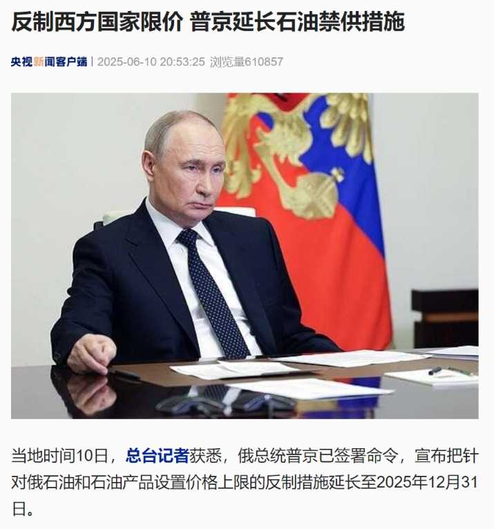 俄总统普京已签署命令,宣布把针对俄石油和石油产品设置价格上限的反制措施延长至2025年12月31日。