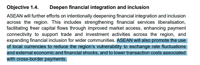 5月26日,东盟发布《2026-2030年经济共同体战略计划》,承诺推动本币在贸易和投资中的使用,通过推广本币结算、加强区域支付互联互通等措施,减少汇率波动影响。