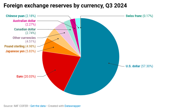 虽然转变在亚洲更明显,但全球也在减少对美元依赖。美元在全球外汇储备中份额从2000年逾70%下降到2024年57.8%。