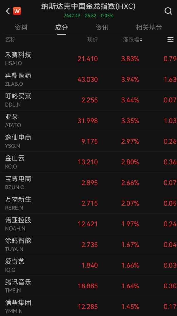 热门中概股表现分化。截至北京时间22:26,纳斯达克中国金龙指数微跌0.35%,禾赛科技、再鼎医药、叮咚买菜等个股涨幅超过3%。