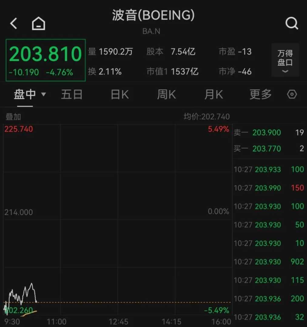 波音公司股价开盘即遭重挫,截至北京时间22:27,波音股价大幅下跌4.76%,市场担忧情绪升温。