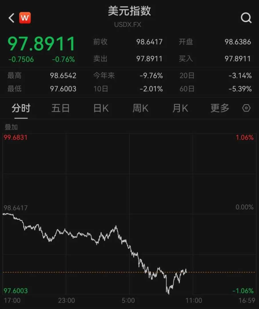 美元指数盘中大跌超过1%,创下新低。截至北京时间22:26,美元指数报收97.8911,跌幅达0.76%。
