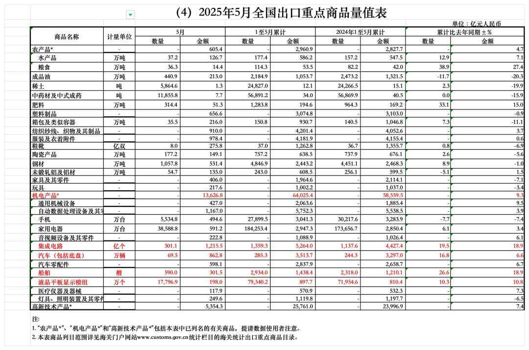 2025年5月全国出口重点商品量值表图源:海关总署官网