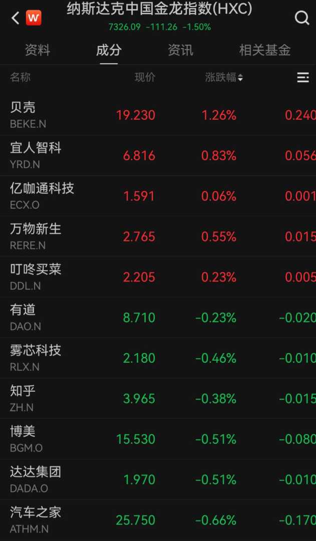 热门中概股普遍下跌,纳斯达克中国金龙指数跌幅达到1.5%。其中,贝壳上涨1.26%,叮咚买菜微涨0.23%。但金山云跌幅超过5%,小鹏汽车和理想汽车跌幅均超过3%。
