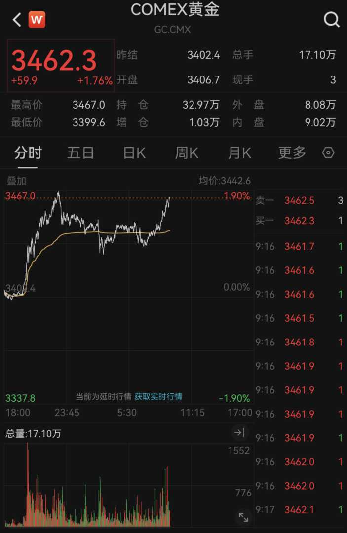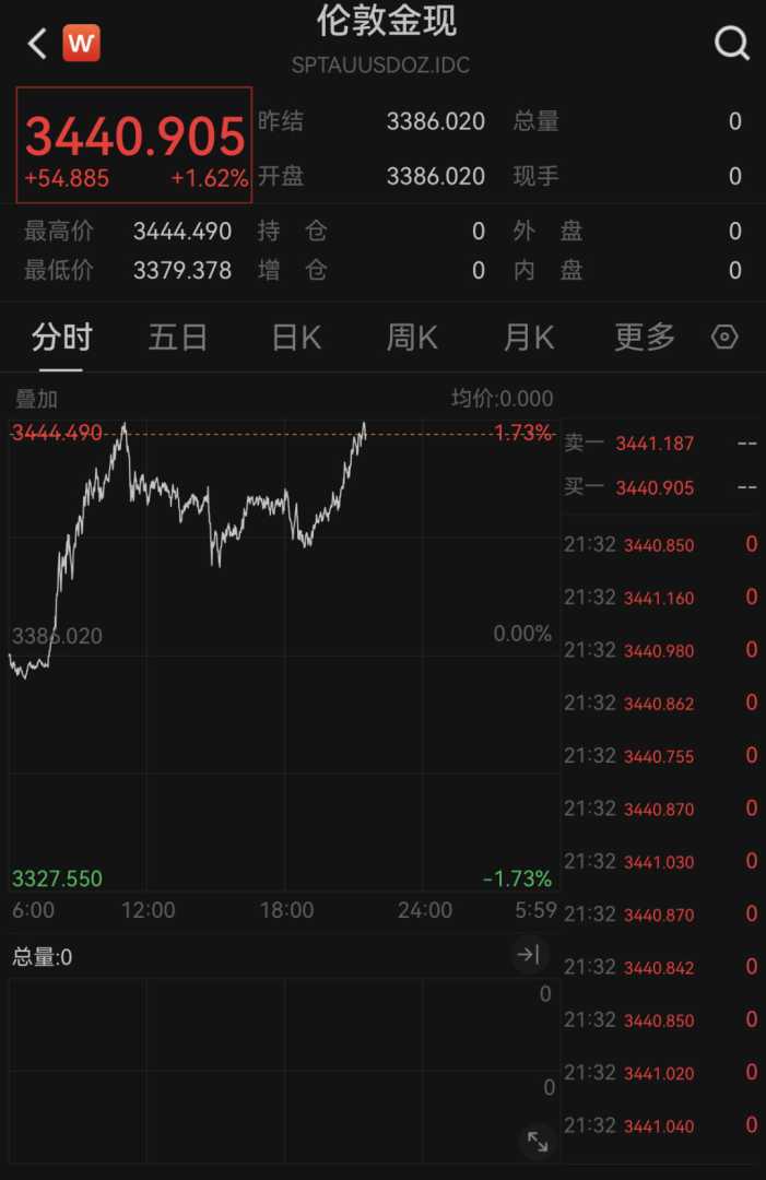 国际金价上涨显著。伦敦金现上涨1.62%,报价3440.91美元/盎司;COMEX黄金期货价格也上涨1.76%,报价3462.3美元/盎司。
