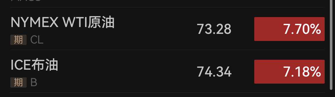 国际油价也迎来大涨。NYMEX WTI原油价格上涨7.7%,报价73.28美元/桶;ICE布油价格上涨7.18%,报价74.34美元/桶。