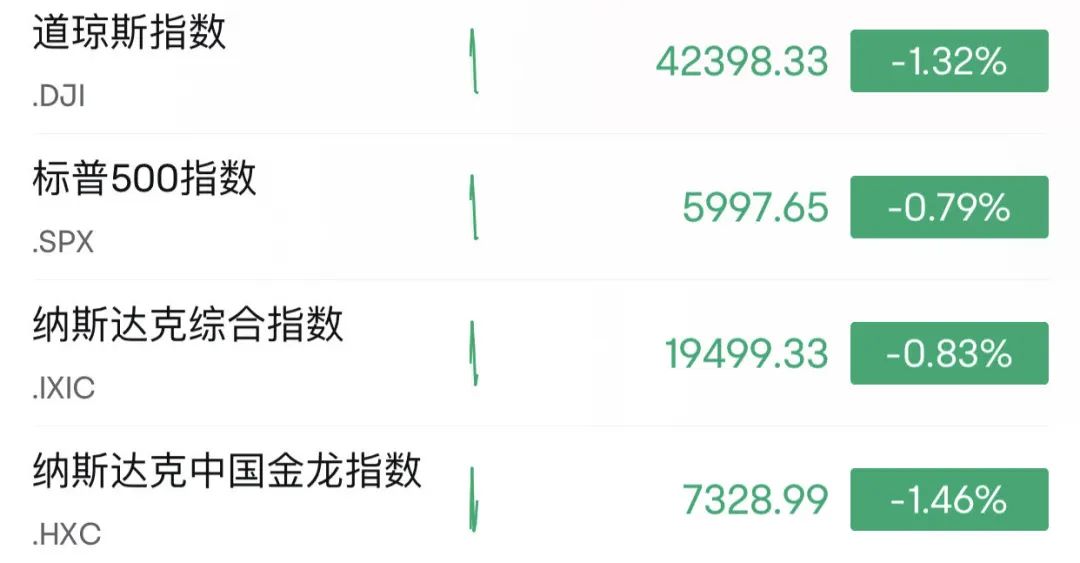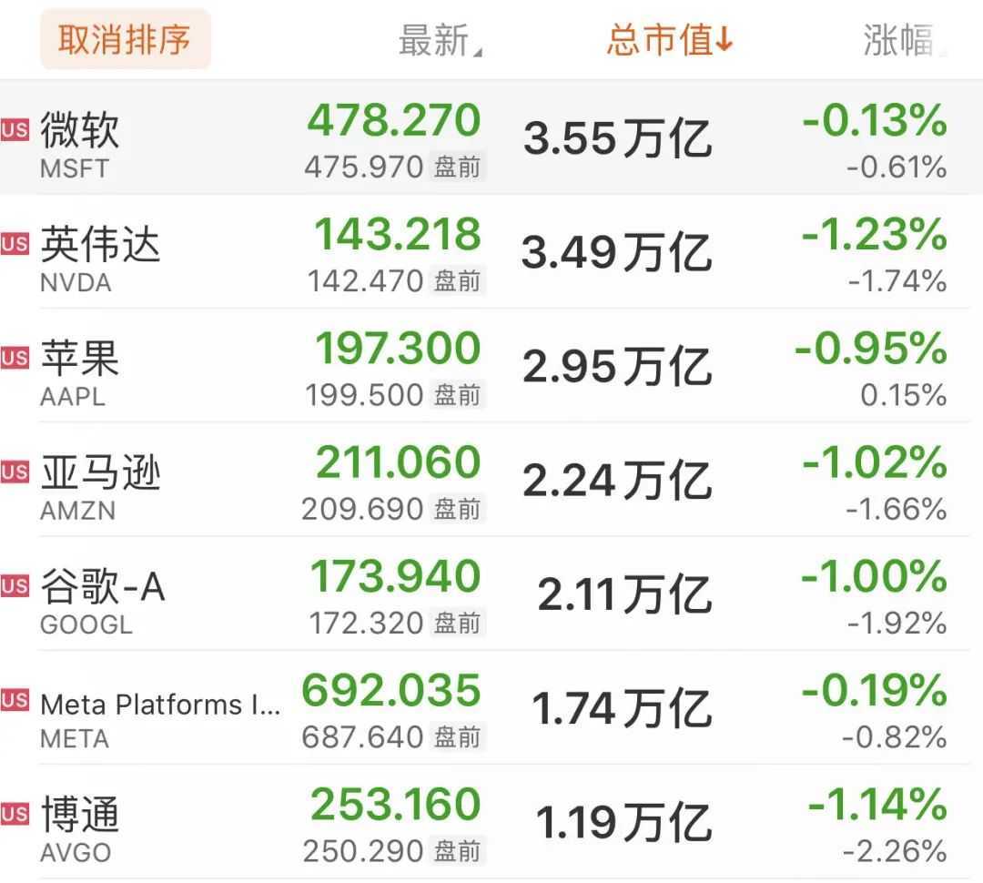 大型科技股普遍下跌,截至发稿,英伟达、亚马逊跌幅超过1%,谷歌A跌1%,苹果、特斯拉接近1%的跌幅,微软、Meta小幅下跌。