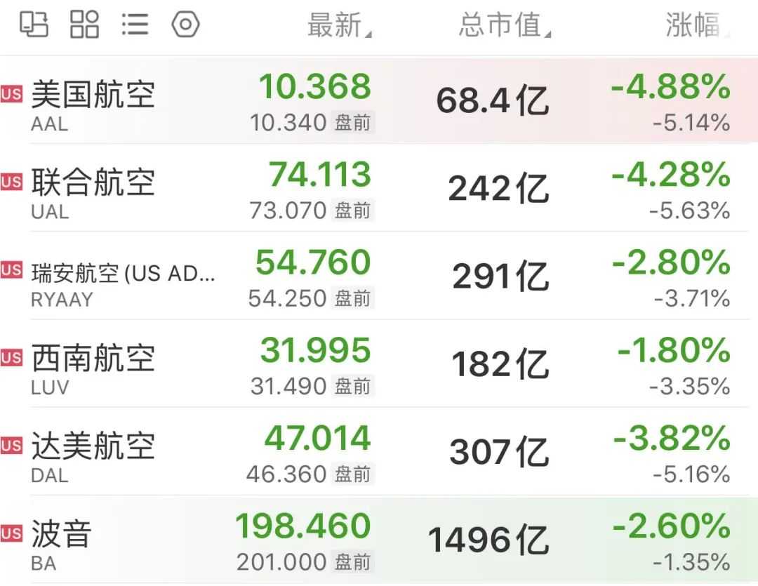 航空股全线下跌,美国航空跌幅接近5%,联合航空跌幅超过4%,波音跌幅超过2%。
