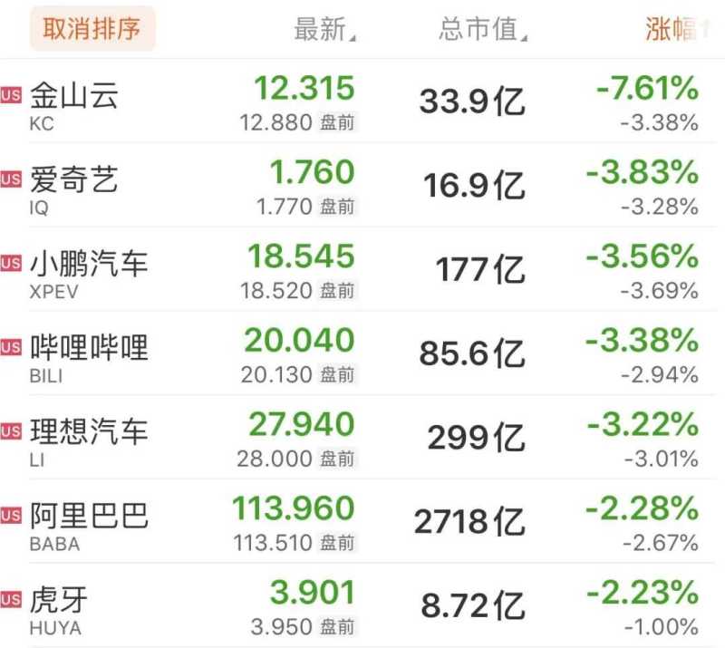 热门中概股普遍下跌,纳斯达克中国金龙指数跌幅超过1%。个股方面,金山云跌幅超过7%,爱奇艺、小鹏汽车、哔哩哔哩、理想汽车跌幅超过3%,阿里巴巴跌幅超过2%,蔚来、百度、京东等跌幅接近2%,拼多多等跌幅超过1%。