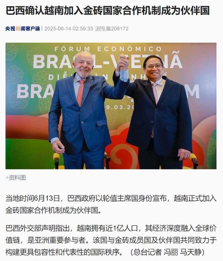 6月13日,巴西政府宣布越南正式加入金砖国家合作机制,成为伙伴国。越南经济深度融入全球价值链,将与金砖成员国共同致力于构建更具包容性和代表性的国际秩序,此举将提升其国际影响力。