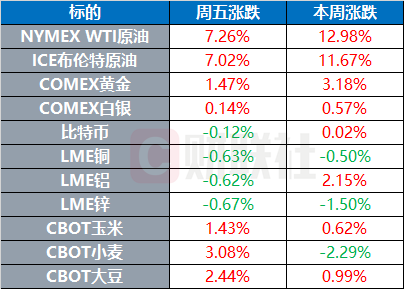 美股周五低开低走,道指、纳指、标普500指数均下跌。国际原油期货大涨超7%,布伦特原油、WTI原油均创本周新高。此外,黄金期货也呈现上涨态势,白银期货小幅上涨。